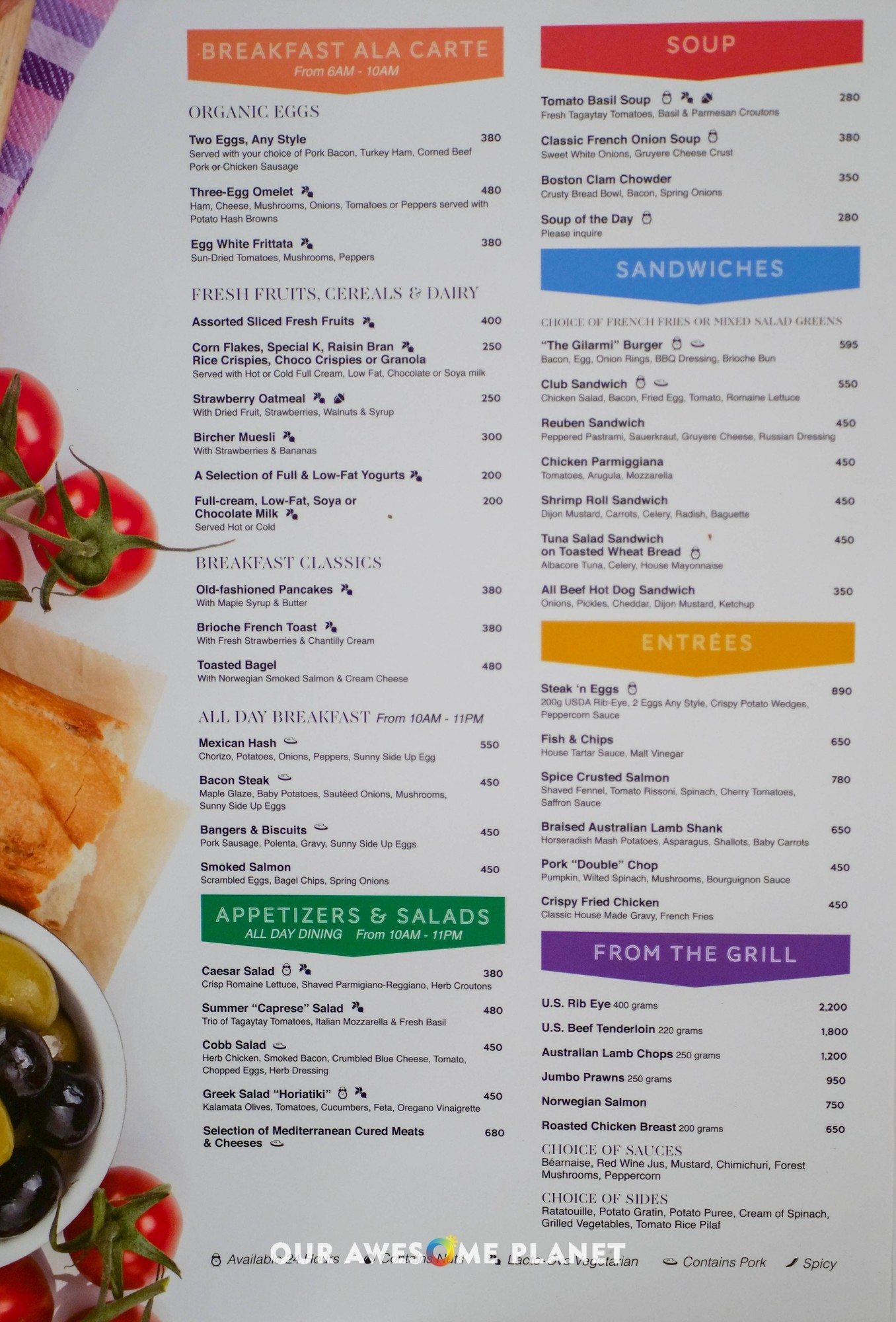 In-Room Menu: Breakfast, Pasta & Pizza, Filipino, Asian | Breakfast Ala Carte, Soup, Sandwiches, Entrees, Appetizers & Salad, From the Grill | Beverage, Dessert, Kids