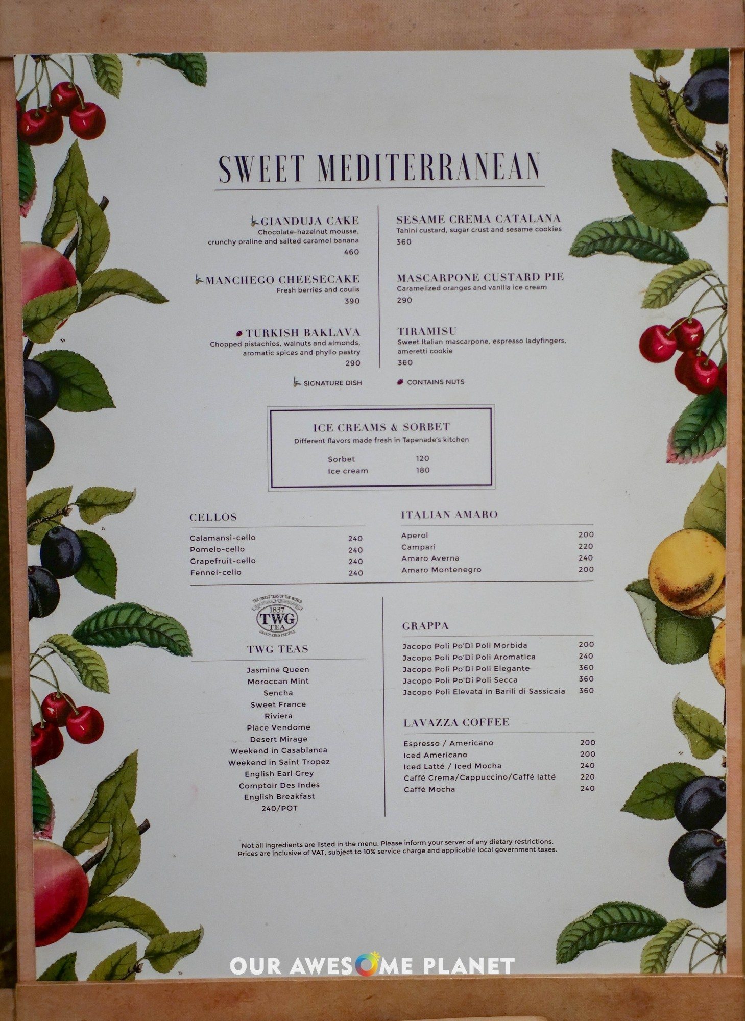 Drinks Menu: Juice & Sodas, Grappa, Liqueurs | Tea, Coffee | Sparkling & White | Red & Rose