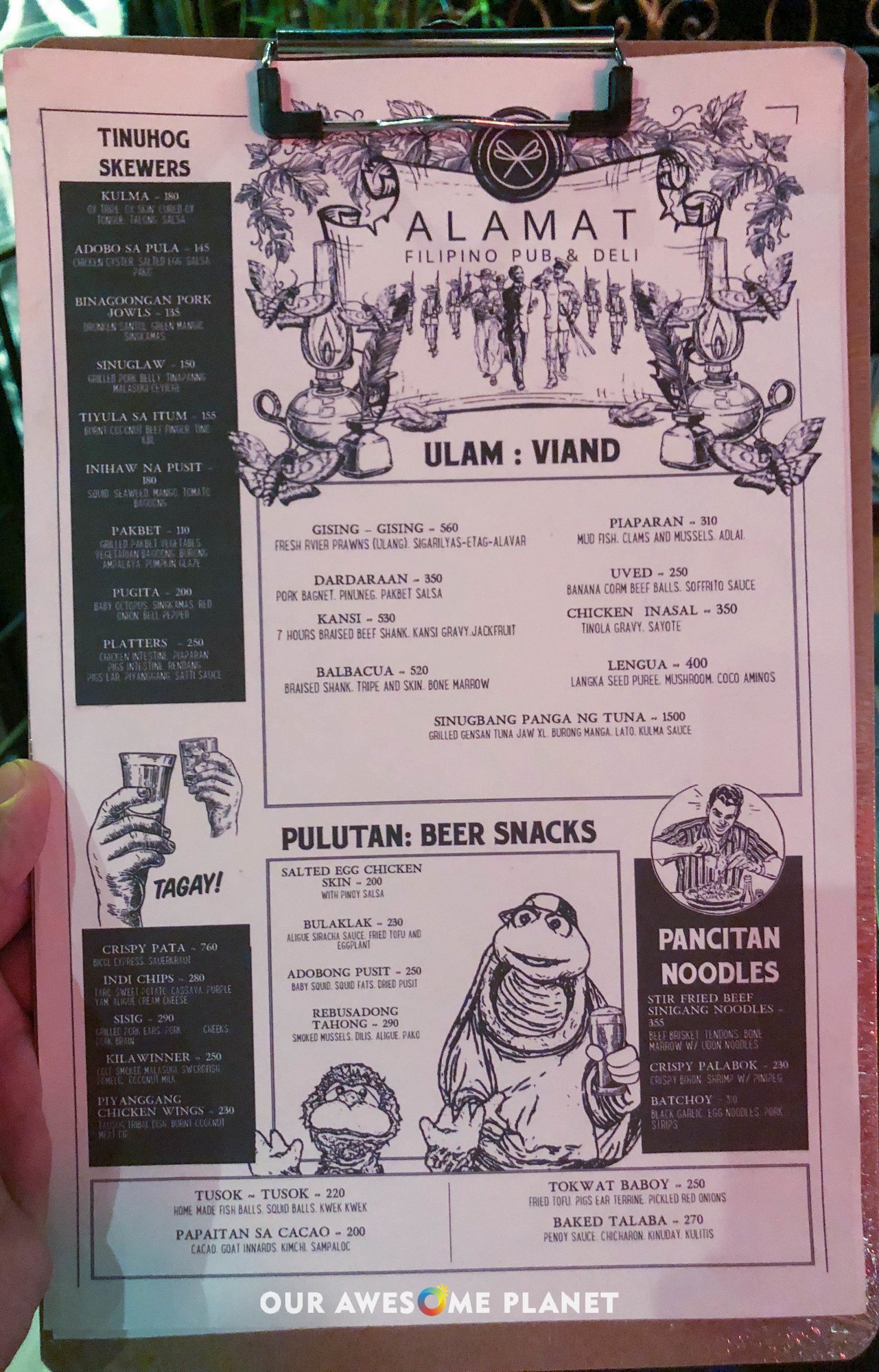 Our favorite from Alamat BF: for pulutan, go for the Salted Egg Chicken Skin and the Bacon Bagnet Hotdog; Tiyula sa Itum and Adobo sa Pula for the Skewers; Kila Winner in the Tagay menu paired with craft cocktails and craft beers if you are hanging out with friends.