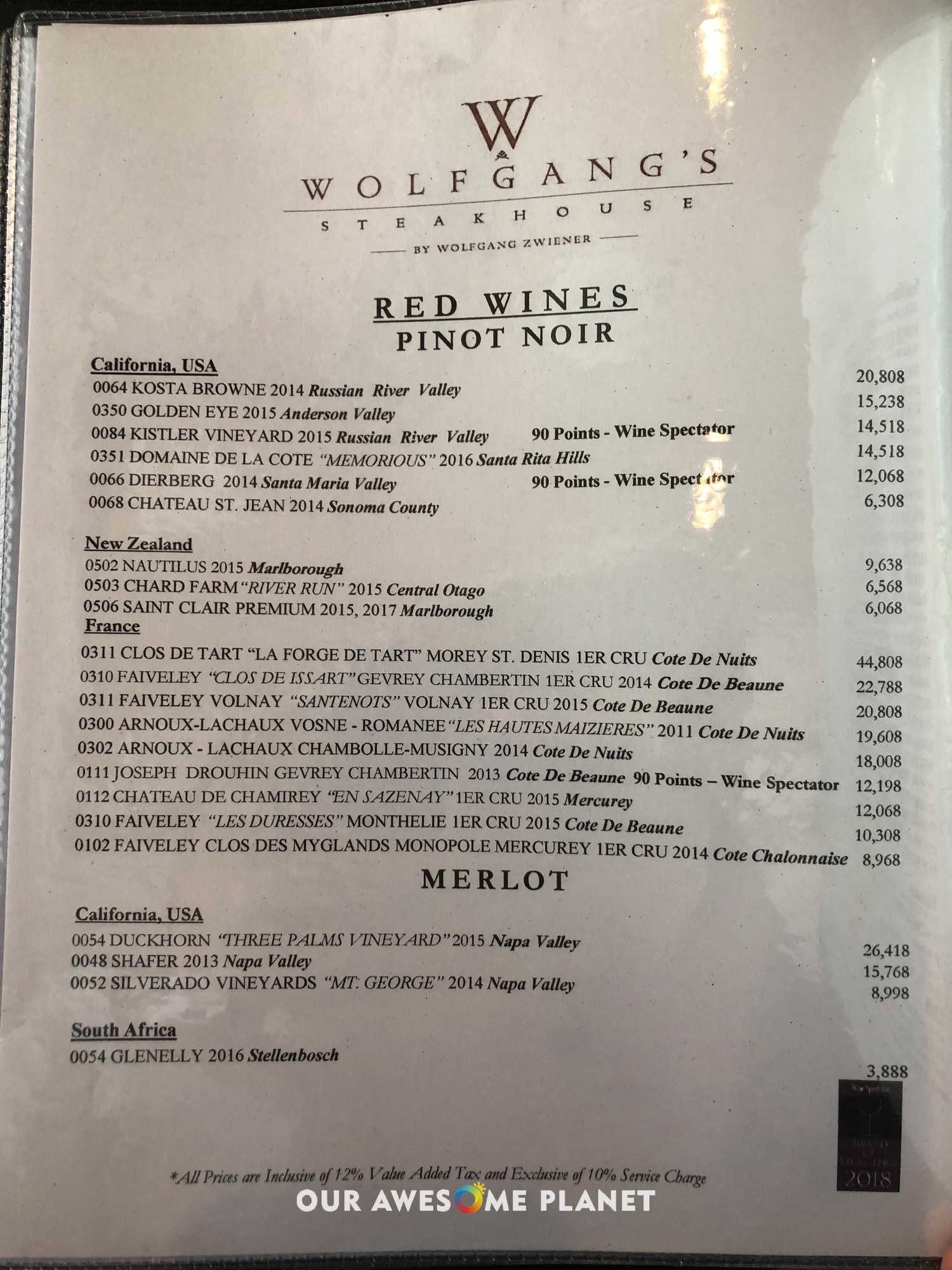 Wolfgang Wine Program: White Wines: Chardonnay | Sauvignon Blanc, Notable White Wines | Red Wines: Pinot Noir, Merlot | Cabernet Sauvignon | Red Blends | Red Blends 2 | Shiraz, Zinfandel, Notable Red Wines | Port Wines, Dessert Wines | Large Format Bottles