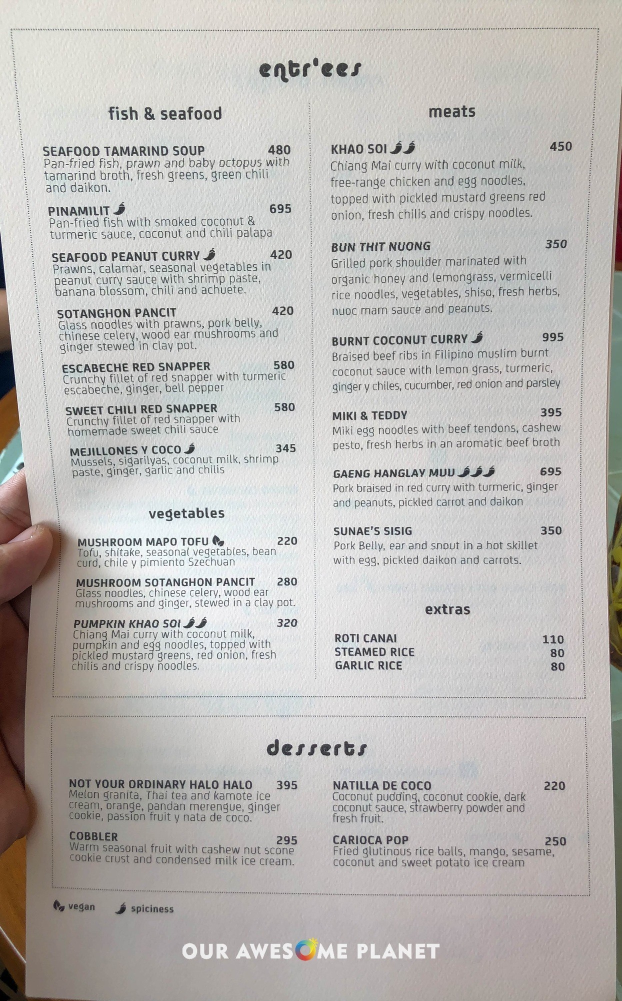 We recommend the Roti Canai with Peanut Curry and Adobo Cachapas for the small dishes and Khao Soi for the mains. All the cocktails were quite good, and they will transport you to her cantina in Buenos Aires. Try the halo-halo for dessert. Budget about ₱800/head.