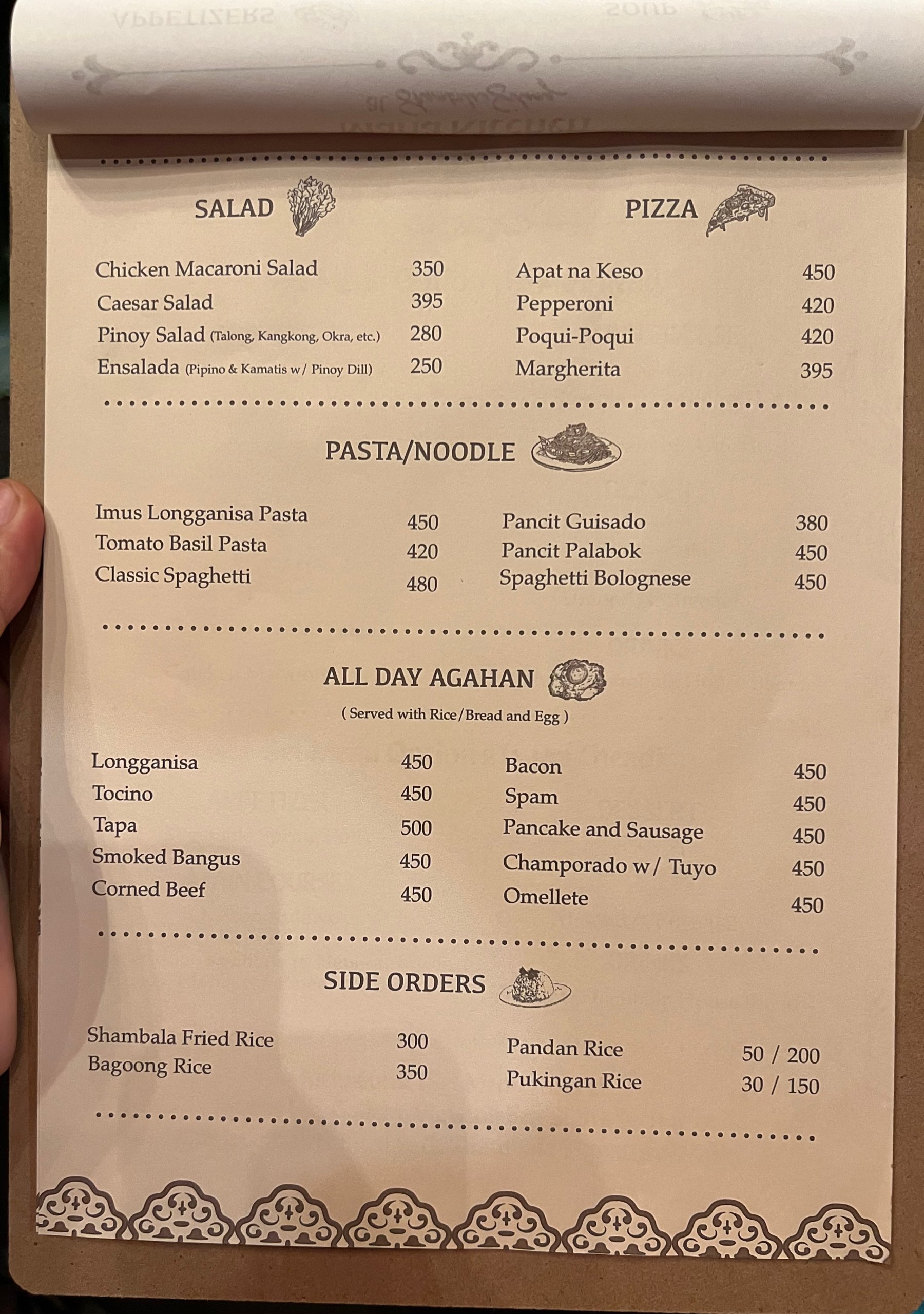 Plan to hang around here the whole day from lunch to sundown to enjoy the garden landscape, savor the food, explore the art, and experience the sunset in the terraces. Make sure to try the Bulalo, Adobo sa Dilaw, Kulawo, and Salmon Annato during your visit. Best to just pay the entrance fees and order a la carte so that you can customize the food to your preferences. Budget about ₱1,500/head.