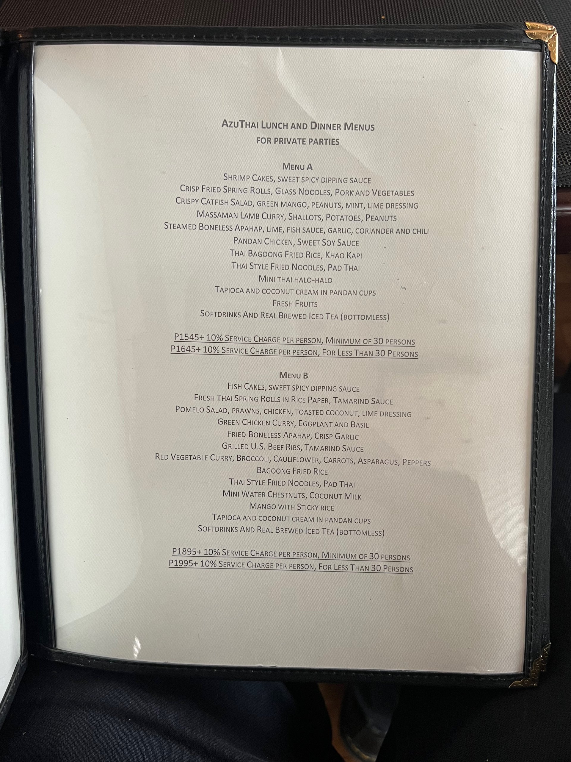 AzuThai is an authentic Thai restaurant in Makati established in 2008 by Chef J. Gamboa and Malu G. Lindo of the Milky Way family. In 2017, it was the first restaurant certified by the Royal Thai Government with the Thai SELECT Seal for the authenticity of its Thai Food and ingredients. It serves homestyle Thai cuisine prepared by Chef Watee from Bangkok, Thailand.