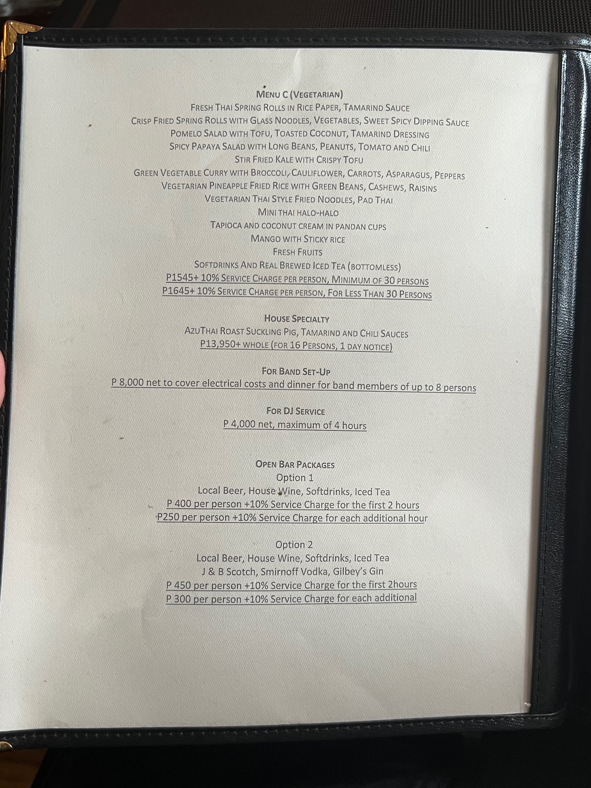 Azuthai menu: Special New Dishes | Azuthai favorites, Azuthai Signature Dishes | Vegetarian Dishes, Appetizers | Soups, Salads, Curries, Noodles and Rice | Mains: Seafood, Pork, Beef and Chicken | Noodle Soup Specials, Desserts | Beverages, Fresh Fruit Juices, Waters | AzuThai Lunch and Dinner Set Menus A & B | Menu C (Vegetarian), House Specialty, Open Bar Package