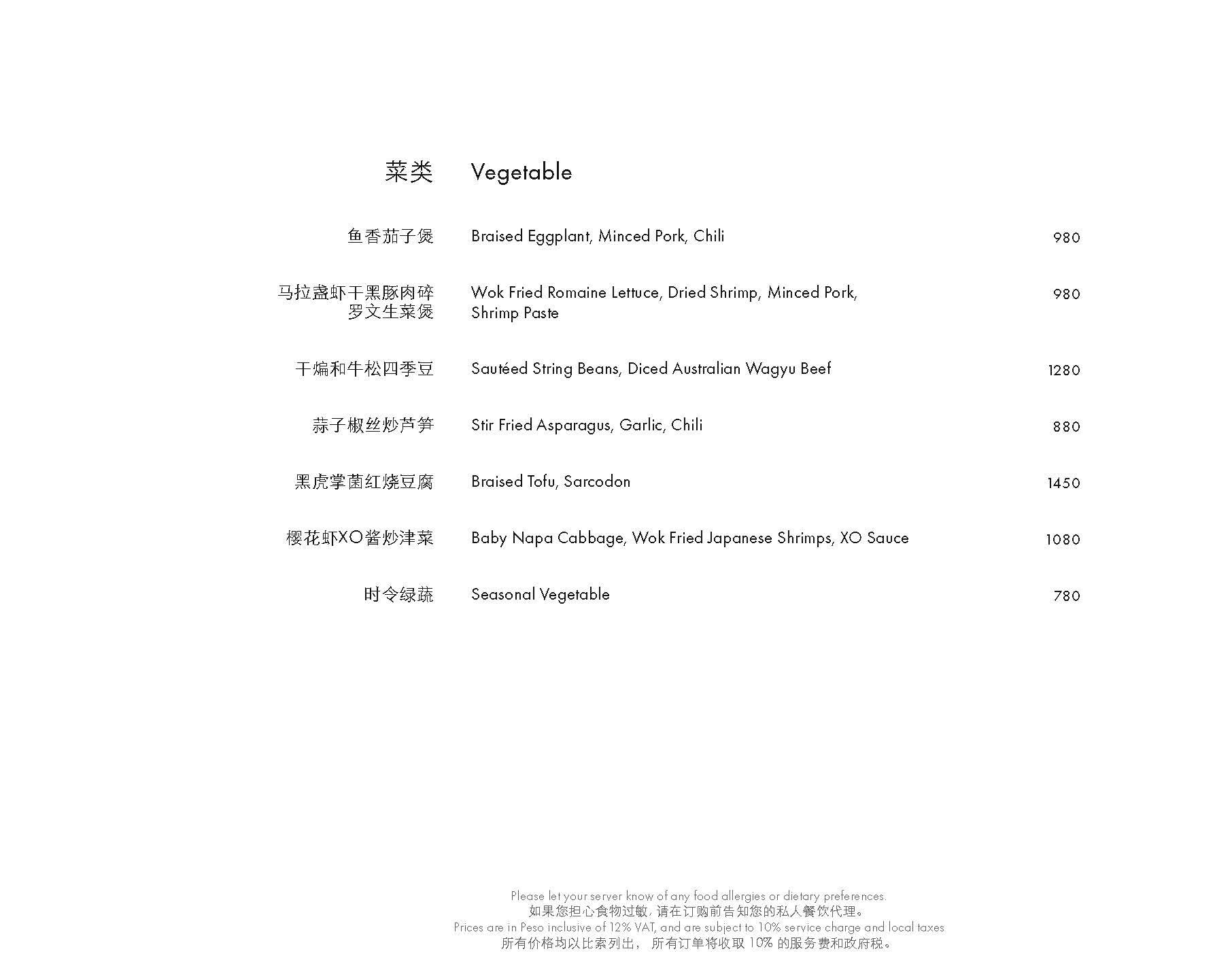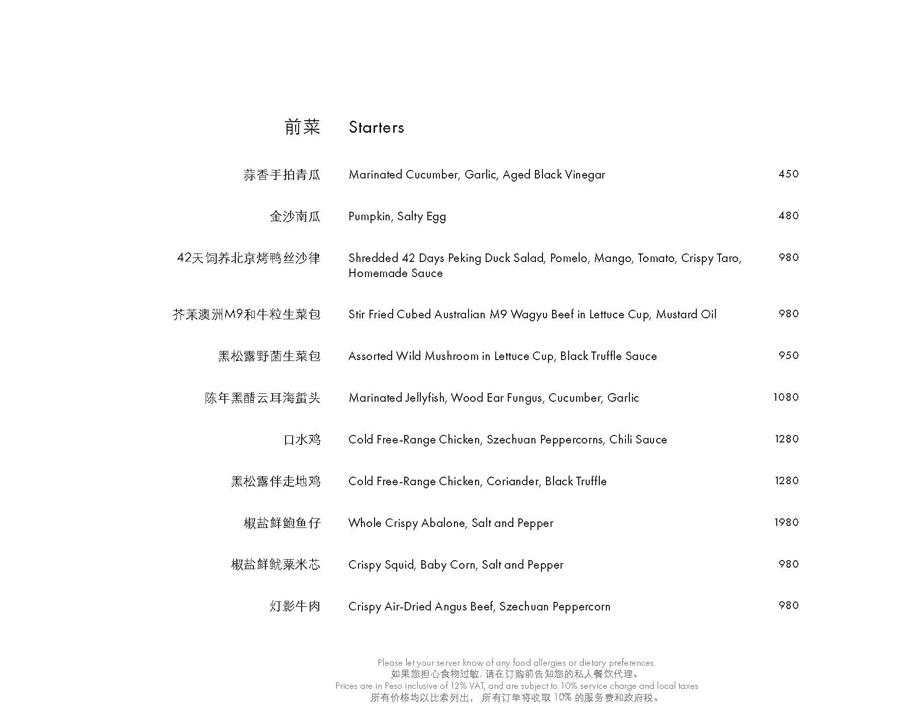 The dishes are mainly crafted from a Cantonese palate with influences of Beijing and Szechuan flavors, utilizing traditional recipes, quality ingredients, and innovative cooking techniques from around the world.