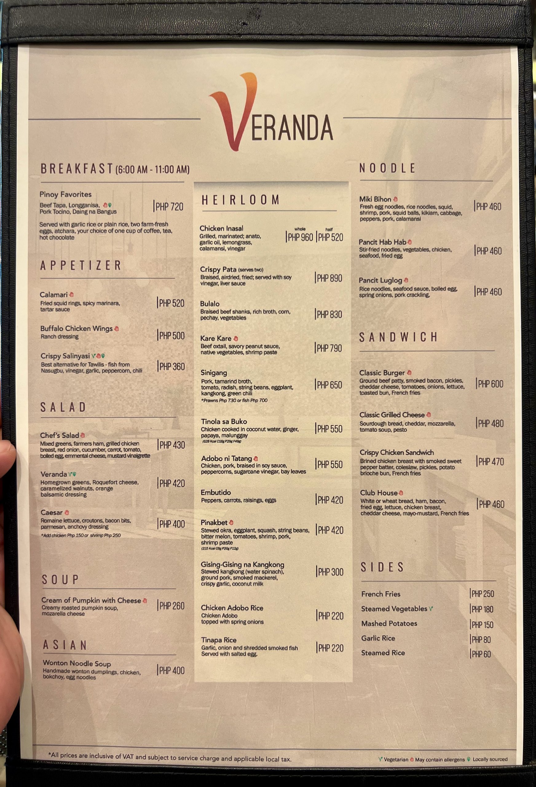 Veranda Menu: Heirloom Menu, Noodle, Sandwich, Appetizer, Salad, Soup, Breakfast | Pasta, Comfort Food, Pizza, Dessert | Beverage List | Cocktail, Wine