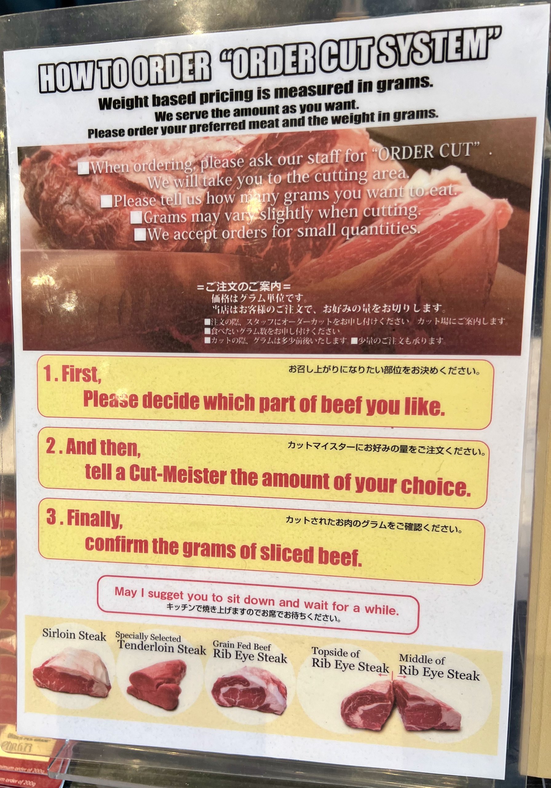 The goal is to get to eat your steak as fast as possible so they already take your order when you enter. There was a long line and everyone was not familiar with the Ikinari Steak experience so it took time.