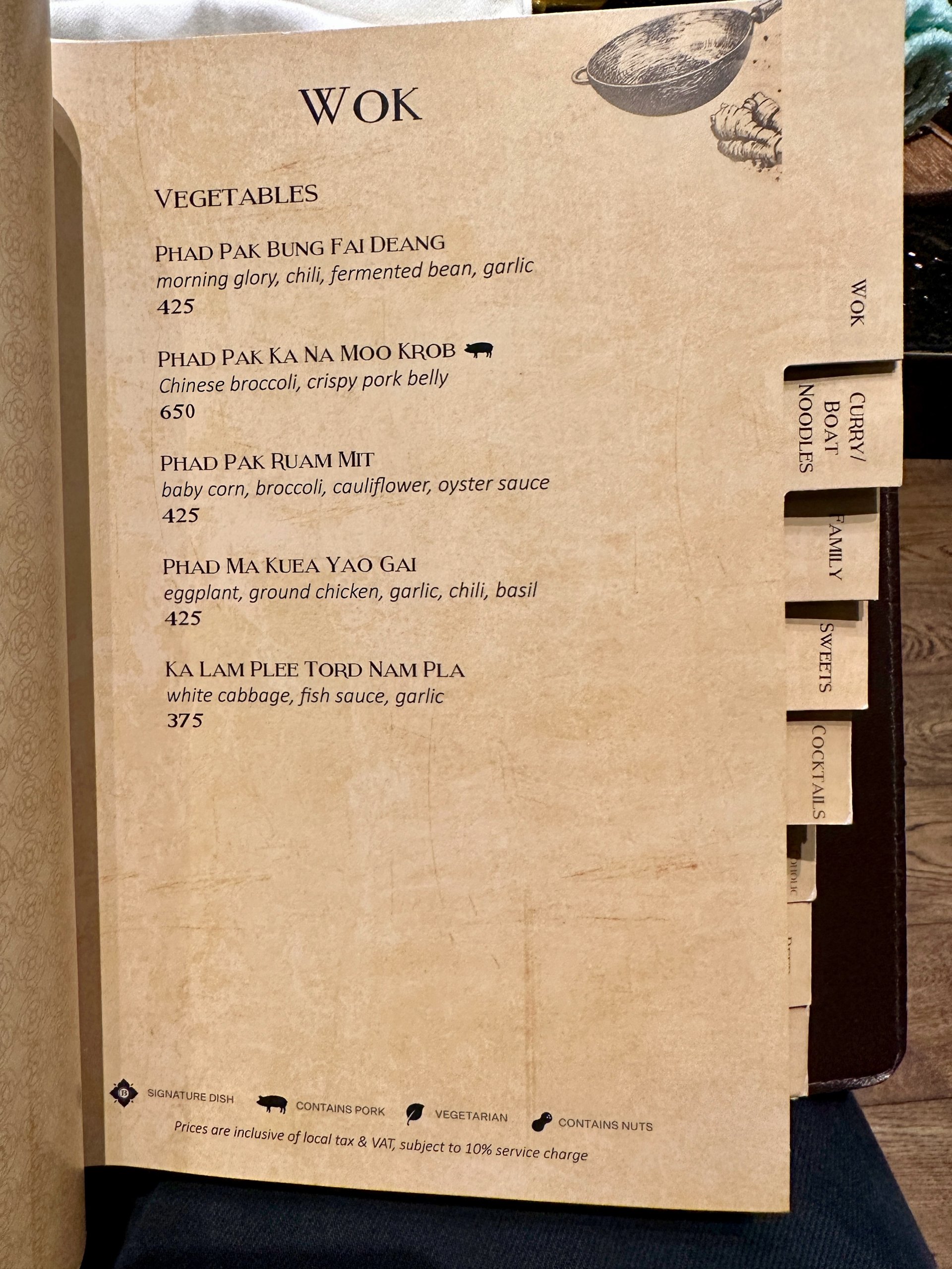 Benjarong Ala-Carte Menu: Appetizers | Appetizers 2 | Soup | Salad | Wok: Noodles & Rice | Wok: Vegetables | Wok: Stir fry | Curry / Boat Noodles | Family | Sweets