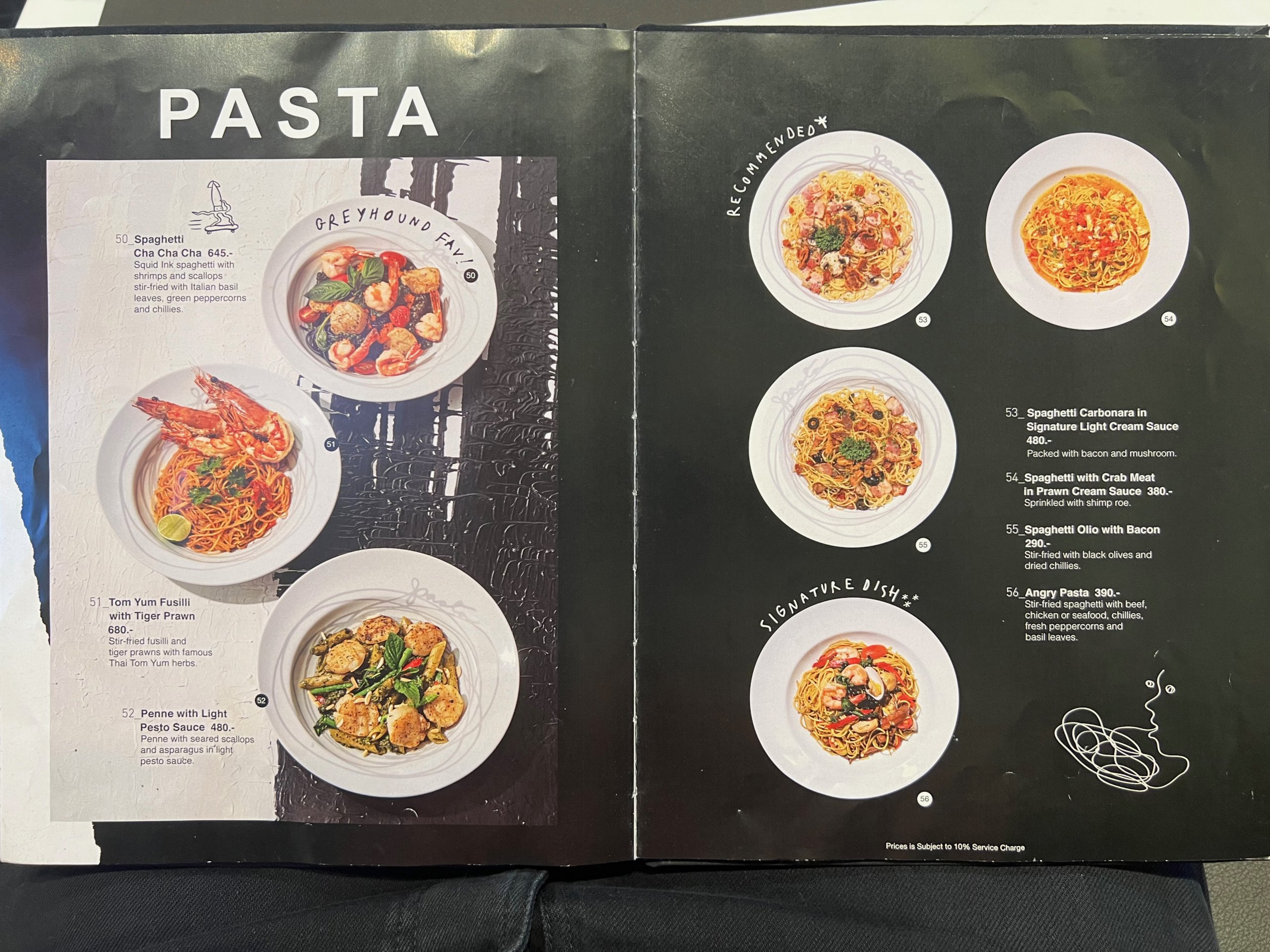 Greyhound Cafe Menu: Soup | Salad | Asian with a Twist | All Time Favorite Appetizers | Appetizers (Born in Bangkok) | Thai & Asian Favorite | More Appetizers | Sandwich & Burger | Eat Main Dish | Main Dish (Born in Bangkok) | Noodles Soup | Noodles | Pasta | Pasta & Rice | Specialty Rice | Vegetarian Lover | Specialty Vegetarian