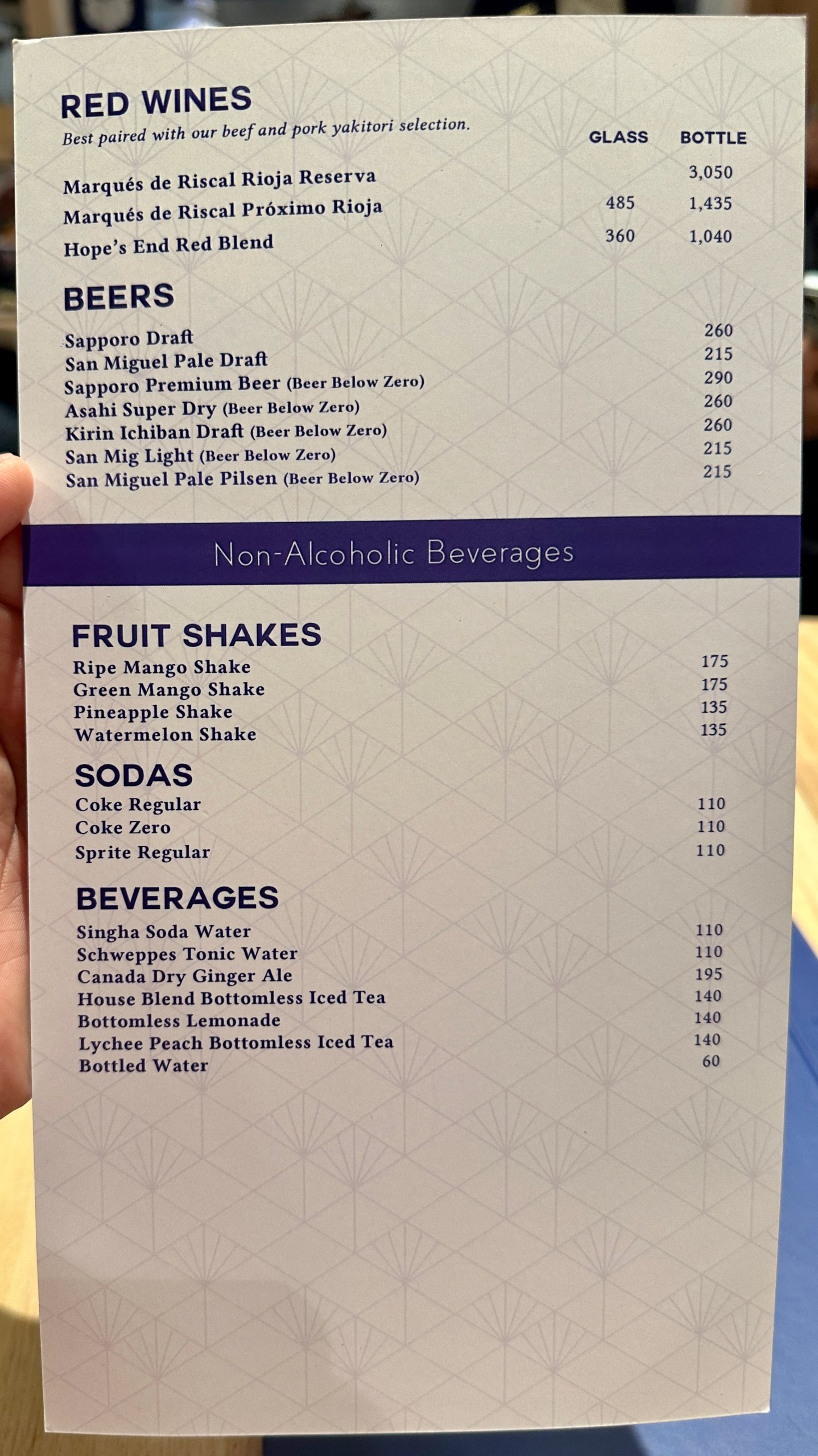 Red Wines, Beers, Fruit Shakes, Sodas, Beverages