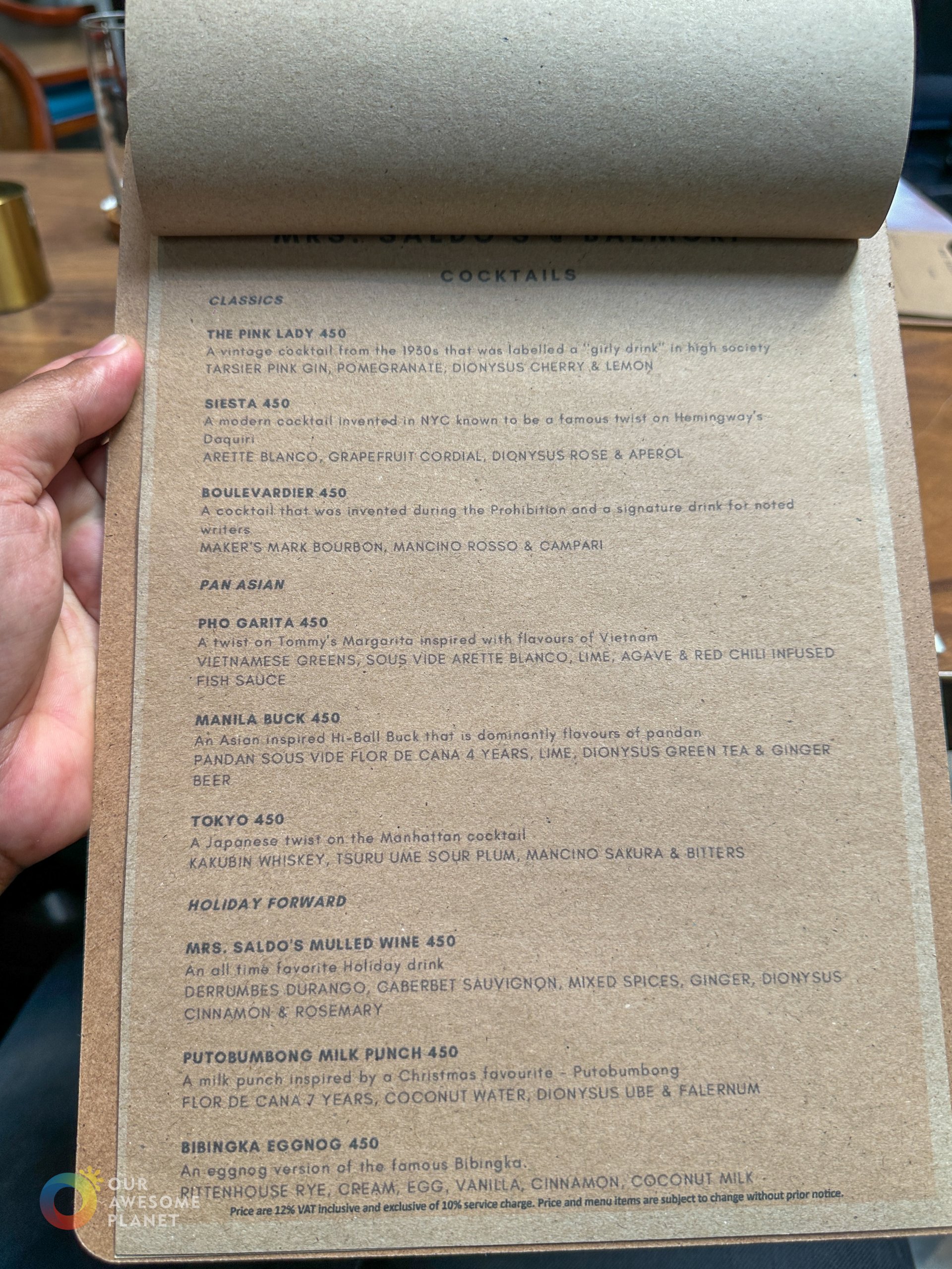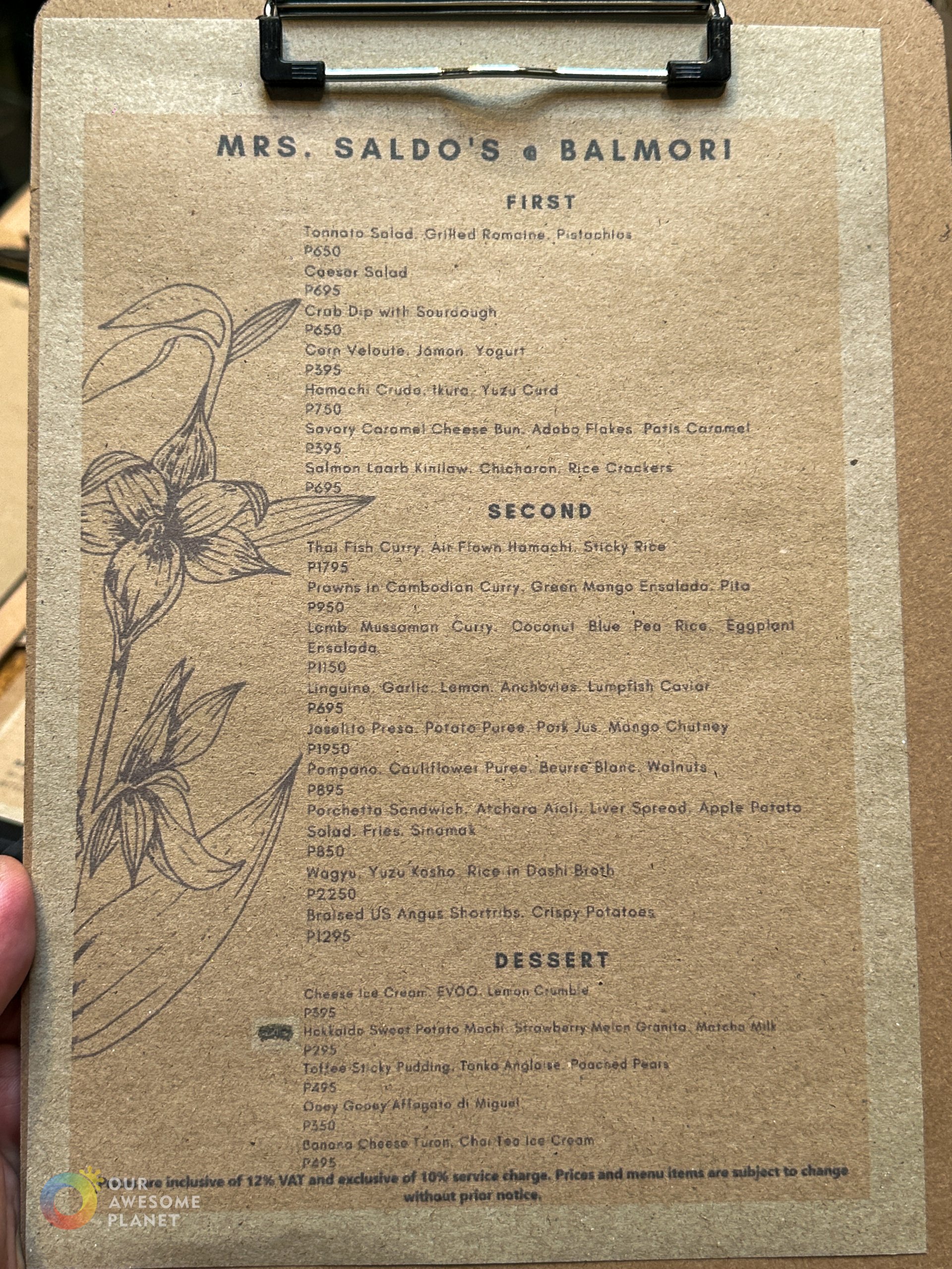 Mrs Saldo’s at Balmori Suites Menu: First, Second, Dessert | Wines | Cocktails | Beers