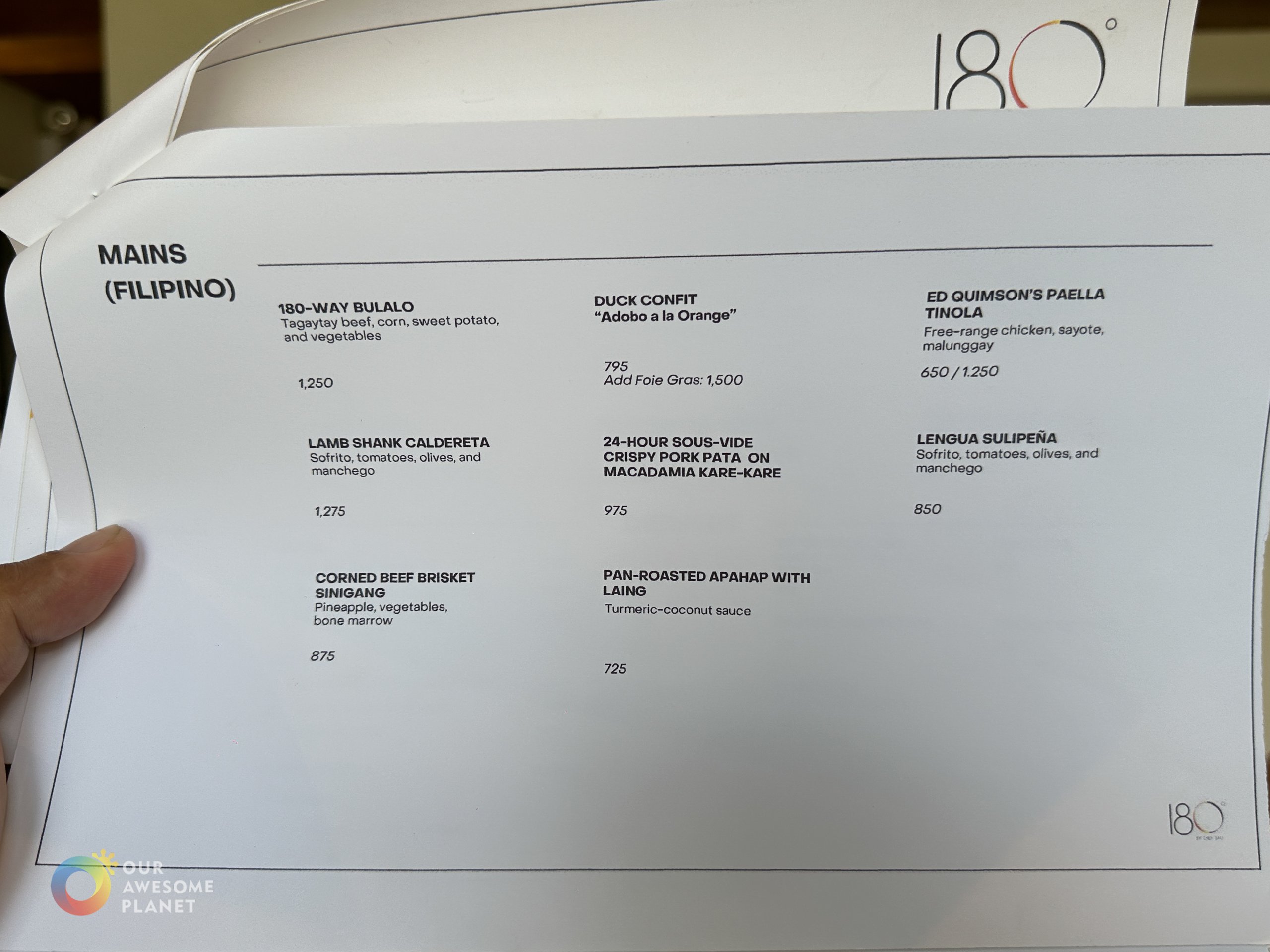 180° by Chef Sau in Tagaytay offers a delectable fusion of Modern Filipino and Western/Mediterranean cuisines, all against the breathtaking backdrop of a 180-degree view of Taal Volcano Lake. Chef Sau’s innovative take on Filipino cuisine never fails to delight, complemented by impeccable service from the culinary team and expertly crafted cocktails from mixologist Gabriel Figueroa. Whether it’s a leisurely Sunday lunch with family or a special occasion, 180° promises an unforgettable dining experience.